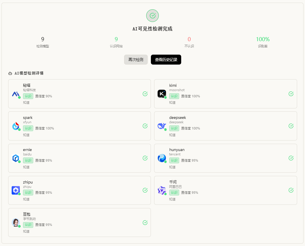 每次检测都是实时的,反映AI模型当前的识别状态。建议每周定期检测以追踪变化趋势。