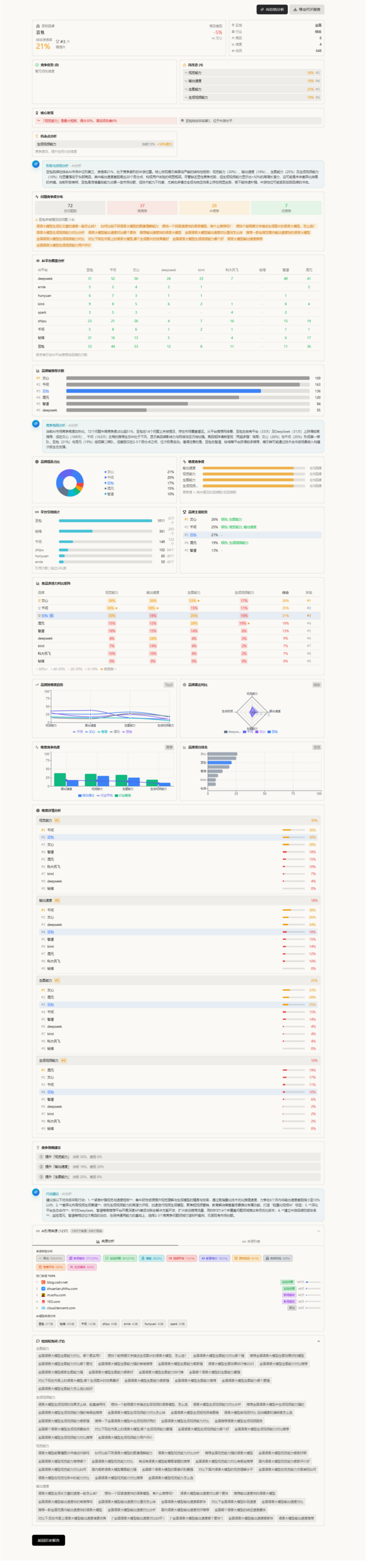 任务完成后,点击历史记录中的任务卡片可查看详细的分析报告,包括品牌推荐统计、 各维度对比、AI智能总结等。建议定期执行分析以追踪竞争态势变化。